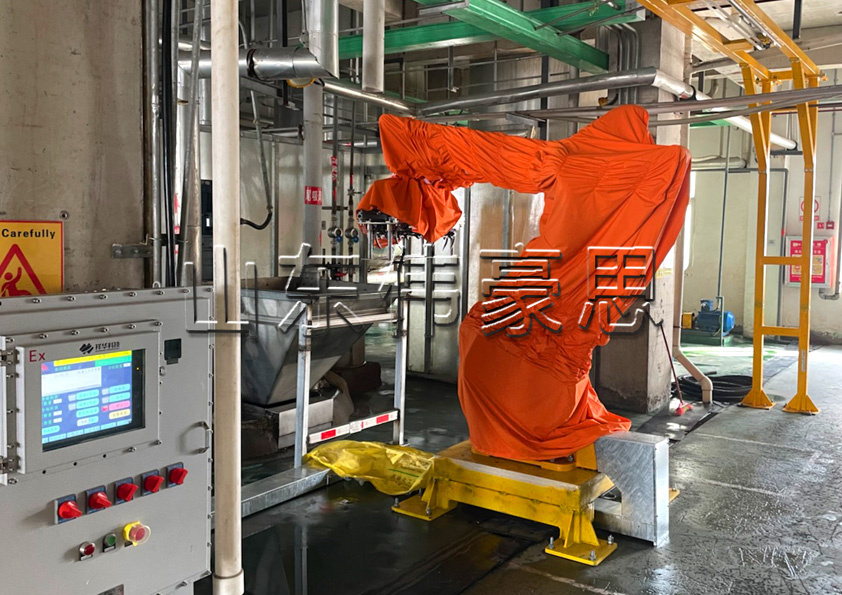 亞硝酸鈉自動(dòng)破袋機(jī)械手,袋料自動(dòng)拆垛拆包機(jī)現(xiàn)場(chǎng)