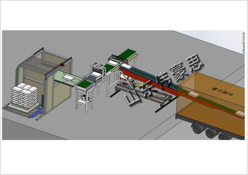 袋料集裝箱自動(dòng)裝車機(jī)的工作流程:貨車停放至標(biāo)識(shí)位置;傳感器感應(yīng)貨車停放位置及角度;底座進(jìn)行位移及角度調(diào)整;將袋裝垛料通過拆垛機(jī)將托盤上的貨物拆垛后,運(yùn)送至傳送帶;再由傳送帶經(jīng)過振平機(jī),將貨物外形整理平整;袋料傳送至撥取裝置,撥取裝置將貨物運(yùn)送至伸縮皮帶機(jī)上;通過伸縮皮帶機(jī)將貨物按照設(shè)定順序擺放至集裝箱內(nèi);整個(gè)的袋料裝車過程結(jié)束。