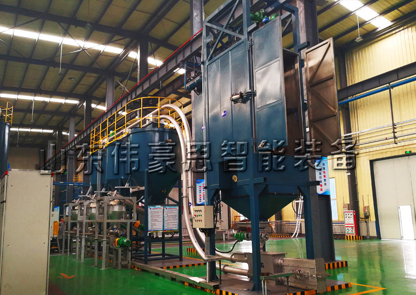 所以山東偉豪思對(duì)顆粒料噸包投料機(jī)進(jìn)行了技術(shù)改造。通過(guò)無(wú)數(shù)次的設(shè)計(jì)與試驗(yàn),針對(duì)下料不均勻的問(wèn)題而研發(fā)出一款能夠保證物料均勻下落的裝置—雙葉輪物料機(jī)。雙葉輪物料機(jī)是安裝在噸包卸料機(jī)的出料口,用于保證物料均勻下落,該裝置能有效緩解噸包卸料機(jī)物料下落不均勻的問(wèn)題,通過(guò)這一裝置的搭配使用,在物料拆袋卸料、輸送生產(chǎn)時(shí)再也不會(huì)發(fā)生擠壓和堵塞等現(xiàn)象。