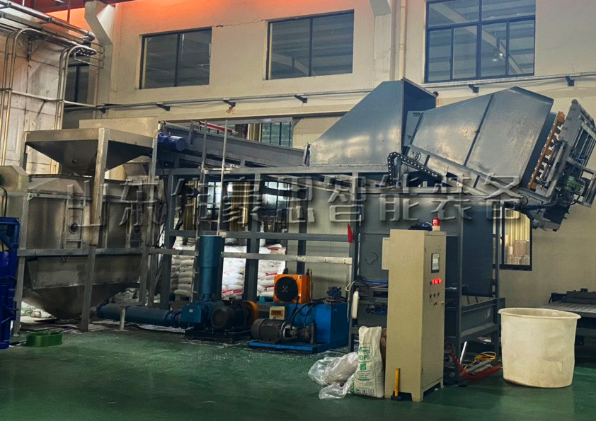 礦石粉翻垛式自動(dòng)拆包機(jī)的工作流程是: