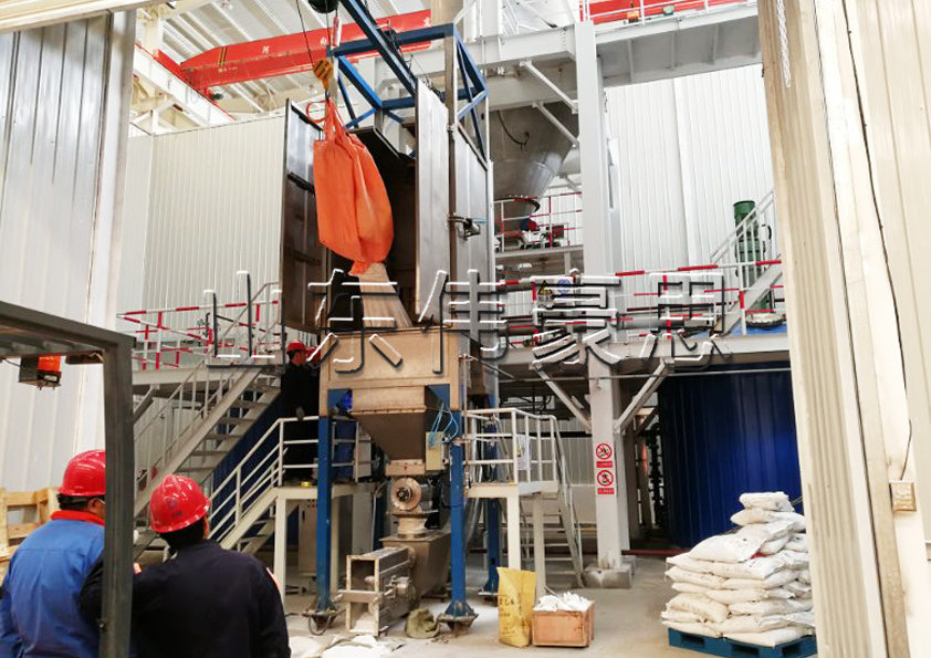 山東偉豪思碳酸鈉噸袋拆包機(jī)上面配置一個電動吊葫蘆,人工掛帶,電動吊葫蘆自動升起,將噸袋吊至合適位置,然后人工手解噸袋扎口(噸袋需要進(jìn)行二次回收利用的)或者用十字割刀直接割破噸袋(配置割刀),之后是利用物料自身的重力進(jìn)行滑落,使噸袋內(nèi)的物料靠重力落進(jìn)貯都中來完成卸料工作,為了使物料卸料過程更加順利,在噸袋噸袋機(jī)的底部會配置兩個到四個振動氣缸來幫助它順利的卸料。