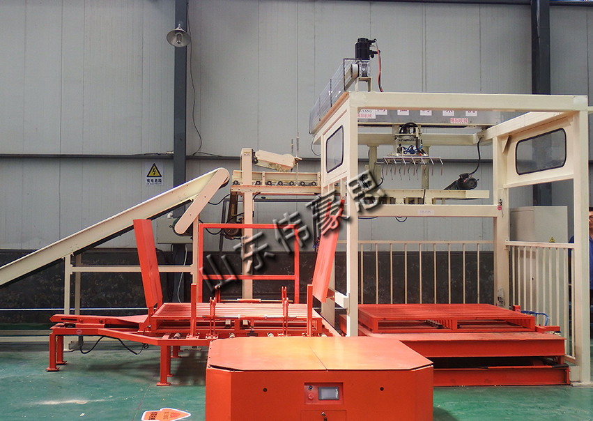 平板上工件符合棧板要求的一層工件,平板及工件向前移動(dòng)直至棧板垂直面。上方擋料桿下降,另三方定位擋桿起動(dòng)夾緊,此時(shí)平板復(fù)位。各工件下降到棧板平面,棧板平面與平板底面相距10mm,棧板下降一個(gè)工件高度。往復(fù)上述直到棧板堆碼達(dá)到設(shè)定要求。