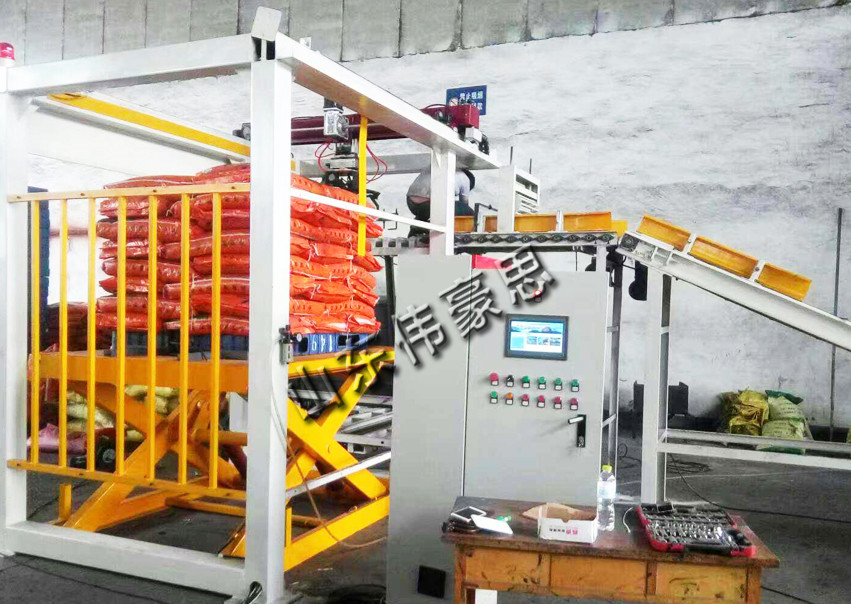 一般多數(shù)的全自動(dòng)面粉包裝碼垛機(jī)會(huì)輔助托盤庫,更換托盤也不需要人力的介入,在托盤碼垛完成之后叉車將托盤移走,然后新的托盤由托盤庫運(yùn)送至指定的位置。