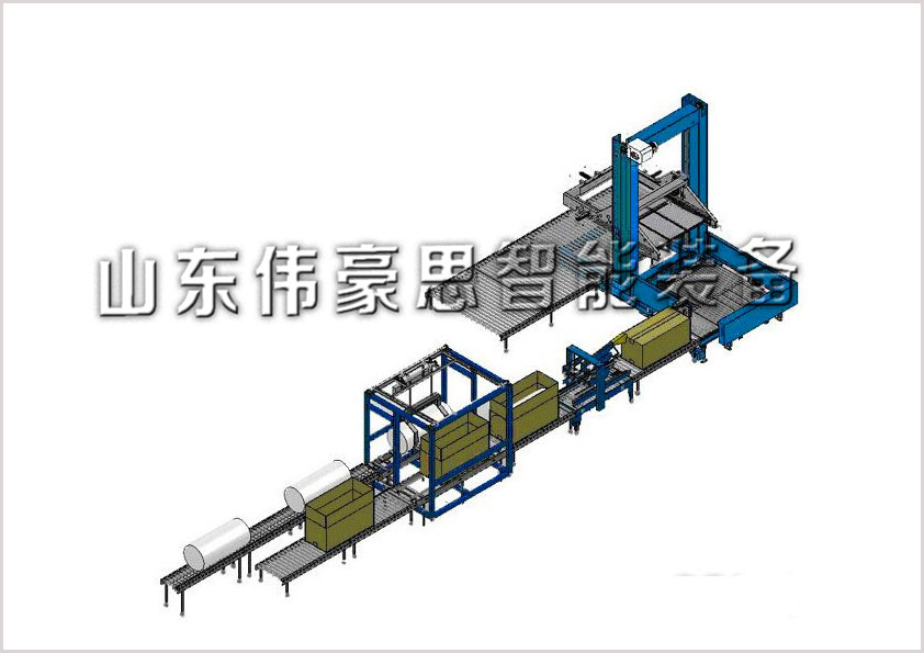 桶裝物料灌裝后,通過滾筒輸送機(jī)到達(dá)裝箱機(jī)內(nèi)部定位,氣動抓手抓起產(chǎn)品提升平移至紙箱頂部,下降至紙箱開口處,抓手松開產(chǎn)品脫落墜入紙箱內(nèi)部,同時鏈條輸送機(jī)阻擋器放行紙箱。輸送至折蓋封箱機(jī)前端,自動折蓋封箱機(jī)紙箱底部面形成的四面可彎折的面板折合,放入物品后輸入由兩側(cè)皮帶驅(qū)動的輸送軌道內(nèi),封箱機(jī)上側(cè)的紙箱折蓋裝置啟動,折蓋封箱一次性完成。進(jìn)入碼垛機(jī)前段:根據(jù)設(shè)定的排列方式強(qiáng)制對紙箱進(jìn)行轉(zhuǎn)向或輸送,以達(dá)到整理、排序的作用。供應(yīng)輸送帶將整理好的第1列紙箱用氣缸推入提升裝置之后依次推入第二列、第三列以形成排序?qū)?。?dāng)紙箱按一定的排序形成一組(層)后升降機(jī)載著排序?qū)由仙⑾蚯耙苿又链a垛裝置上部,并平穩(wěn)地放在棧板(或前一排序?qū)樱┥?,以形成自動碼垛。碼垛裝置是依靠變頻馬達(dá)和鏈條來完成其升、降和前進(jìn)(后退)的。棧板庫可堆積12個空棧板,并按程序要求定時向碼垛裝置供應(yīng)棧板。由單獨電機(jī)提供動力。