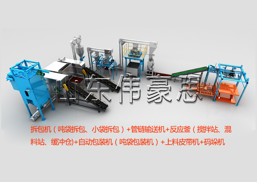 自動拆垛機---自動拆包機(噸包、10-50KG小包)---全密閉管鏈輸送機(多點進料多點出料)--料倉(反應(yīng)釜、混合機)--自動配料---自動包裝(噸包、10-50KG小包)--碼垛機械手---定位輸送(叉車、AGV小車)