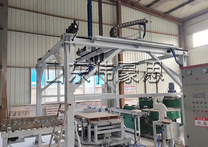 3.桁架碼垛機(jī)將成列磚在托盤上進(jìn)行碼垛,根據(jù)每層確定的碼垛塊數(shù),將磚進(jìn)行交叉碼放。滾筒輸送線提供空托盤配合桁架碼垛機(jī)完成碼垛。