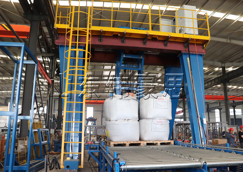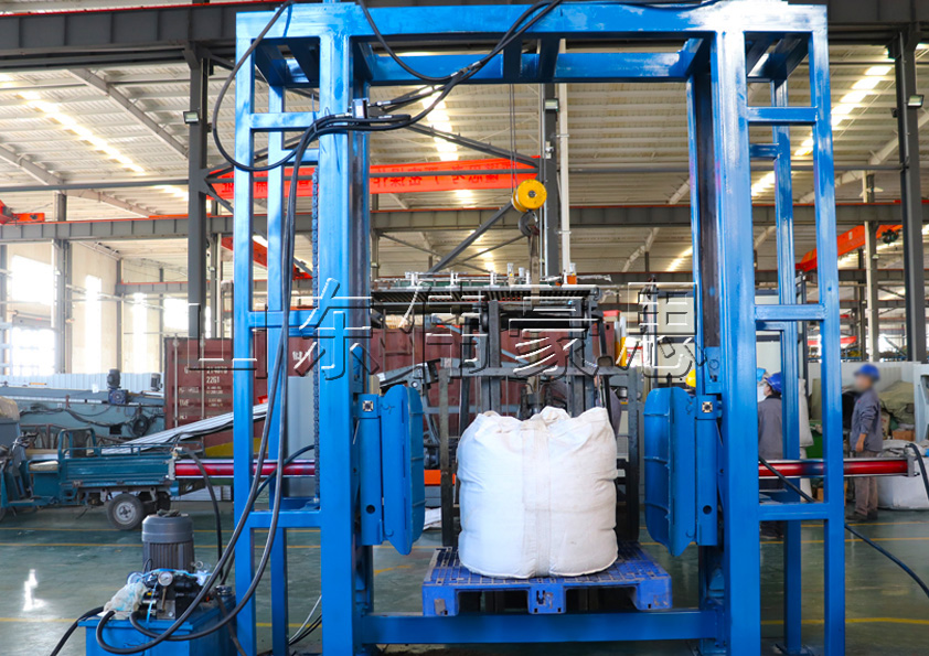 4.龍門式自動裝車機插取噸袋從運輸車輛車廂尾部上方進入,向車頭方向移動, 到達指定裝車位置時,裝車機停止移動,將2個噸袋碼放到車廂定裝車位置,自動裝車機的裝車叉具有護包、整形能力;